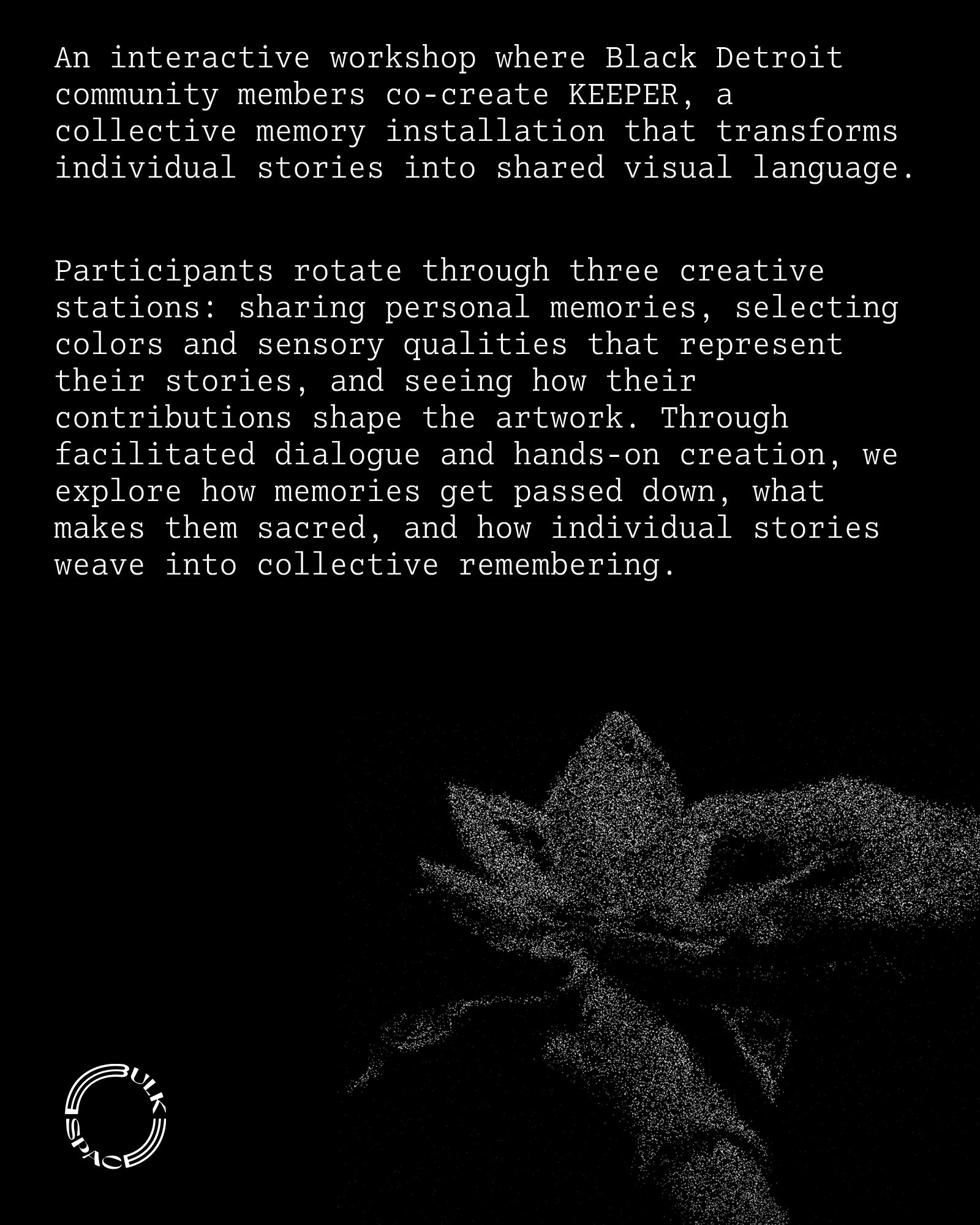 Held In Sight is an interactive workshop where Black Detroit community members co-create KEEPER, a collective memory installation that transforms individual stories into shared visual language. Through facilitated dialogue and hands-on creation, we explore how memories get passed down, what makes them sacred, and how individual stories weave into collective remembering.